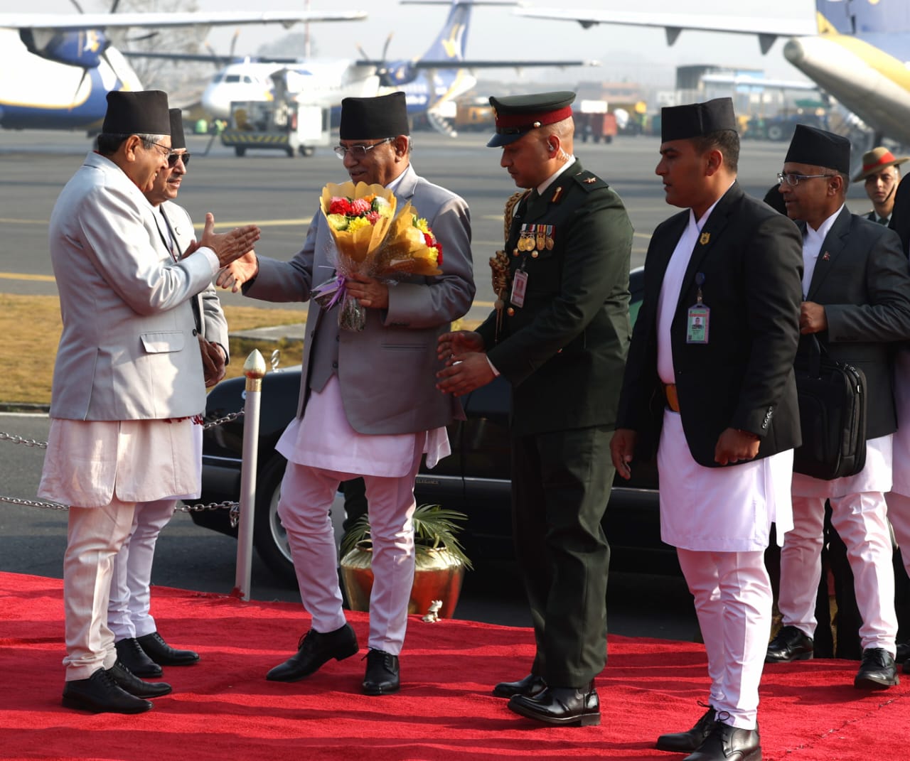 युगान्डाबाट उनी नेपाली समयानुसार बिहान २ः४५ बजे कतारको दोहा अवतरण गरेका प्रधानमन्त्री प्रचण्ड भर्खरै त्रिभुवन अन्तराष्ट्रिय बिमानस्थलमा अबतरण गरेका हुन ।