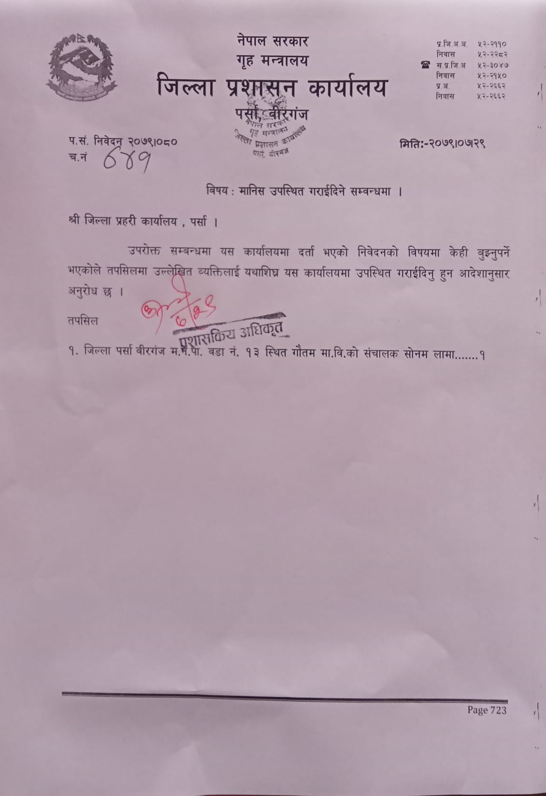 वीरगञ्ज, २९ कार्तिक । वीरगञ्जस्थित गौतम माविका सञ्चालक सोनम लामा विरुद्ध जिल्ला प्रशासन कार्यालय पर्साले पक्राउ पुर्जी जारी गरेको छ । अभिभावक संघर्ष समिति, पर्साका अध्यक्ष संदीप साहलाई ज्यान मार्ने धम्की दिएको विषयमा जिल्ला प्रशासन कार्यालय पर्सामा परेको उजुरीको आधारमा छानबिनका लागि उपस्थित गराउन भन्दै जिल्ला प्रहरी कार्यालय पर्सालाई पत्र काटेको हो ।